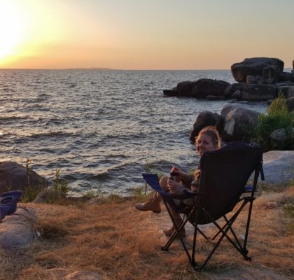We sat on the rocks watching the striking sunset. Our bliss did not last long as were soon swamped with millions of lake flies/”miggies” as we know them. Fortunately they were not the biting type…We ordered a quick meal of fresh fish at the lodge and then hastily jumped into the roof top tent to avoid the miggies covering our car.